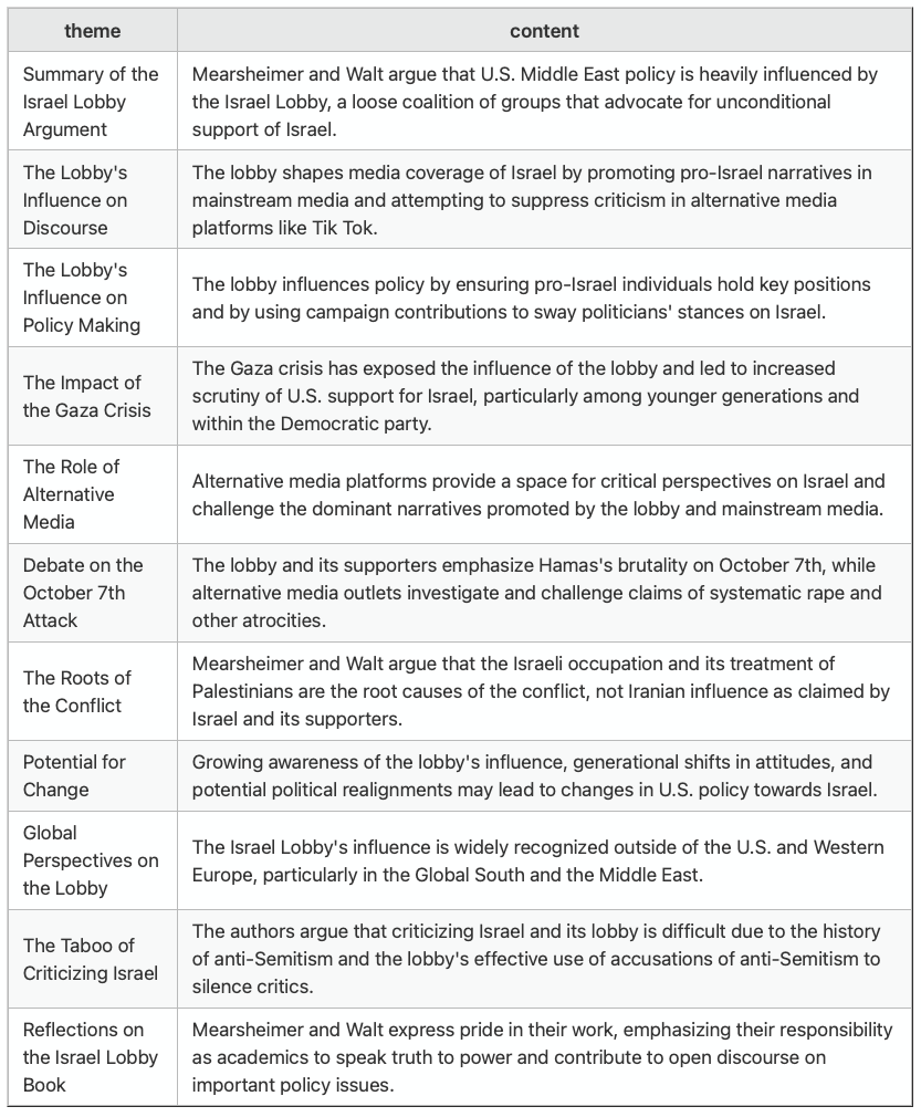 This post applies various Large Language Model (LLM) summarization prompts to the transcript of the program «The Israel Lobby with John Mearsheimer and Stephen Walt | Outside the Box Podcast» by the YouTube channel NDISC.