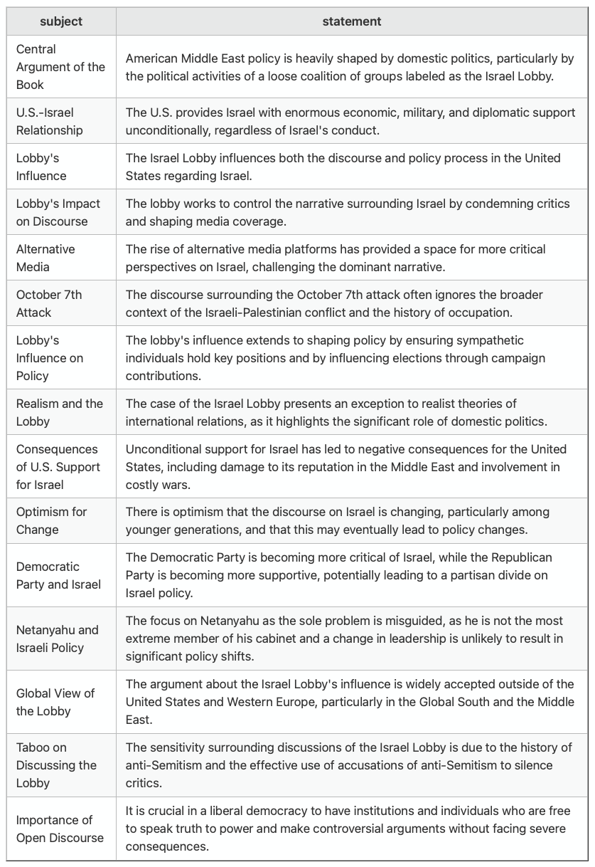 "The central argument of the original article in the subsequent book was that American Middle East policy uh was heavily shaped by domestic politics and in particular by the various political activities of a loose Coalition of groups that we labeled uh the Israel Lobby." - Stephen Walt