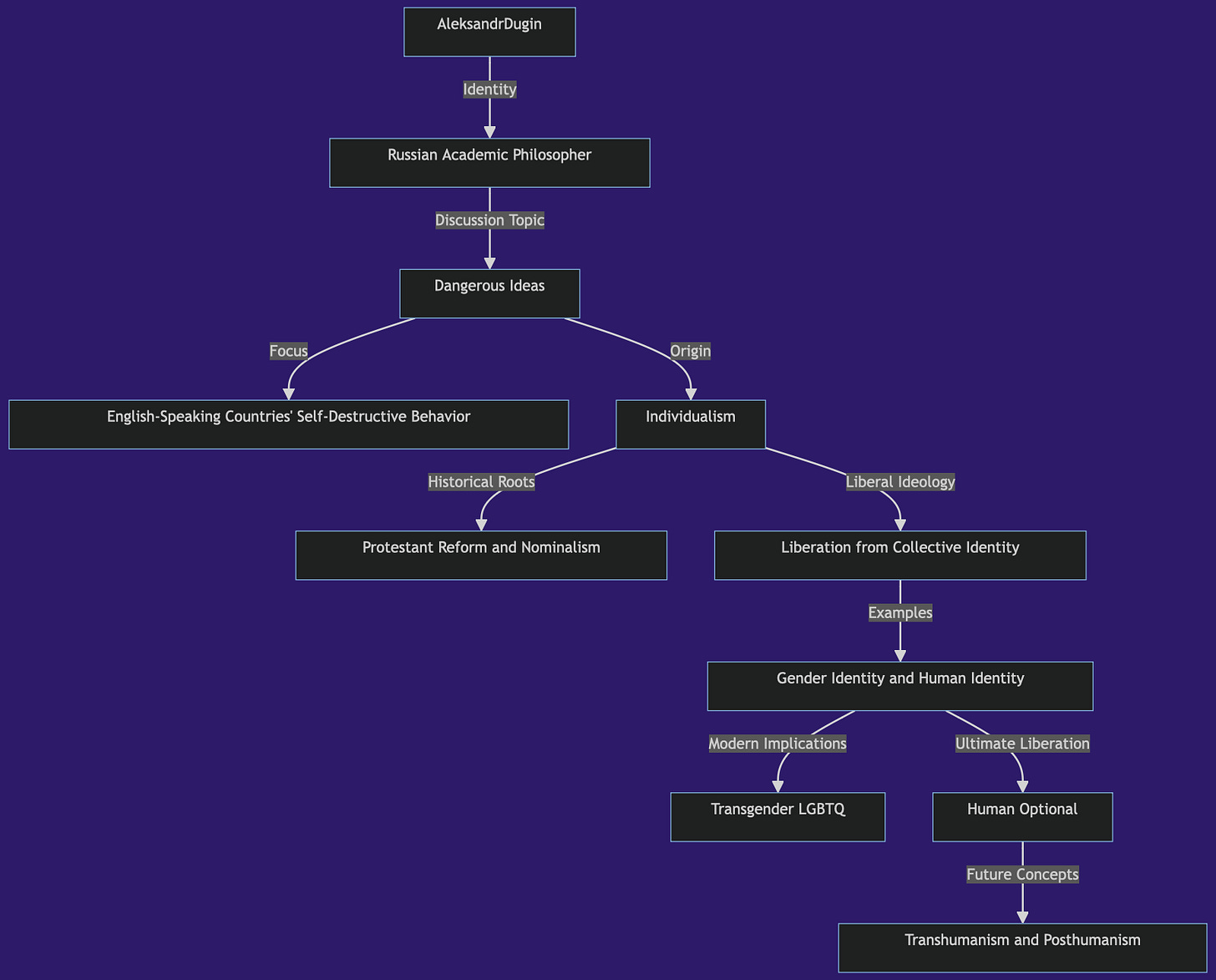 Dugin believes the West's embrace of transgenderism and posthumanism signifies the deconstruction of human identity. He states, "The last step in this process of uh liberalism...will mean precisely the hum human optional."